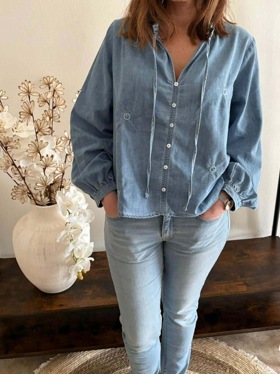 blouse en jean 100% coton , à la fois confortable et tendance . Son denim léger et sa broderie florale ton sur ton apporte une touche raffinée à votre tenue .Sa coupe légèrement ample ,ses manches longues en font une pièce facile à porter au quotidien .