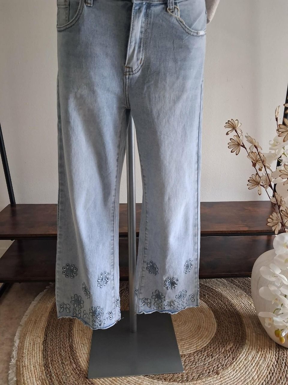 jean flare taille haute avec broderie en bas de jambe .