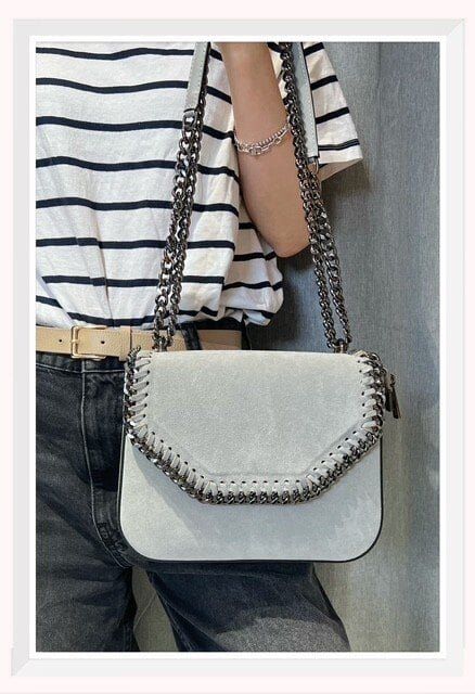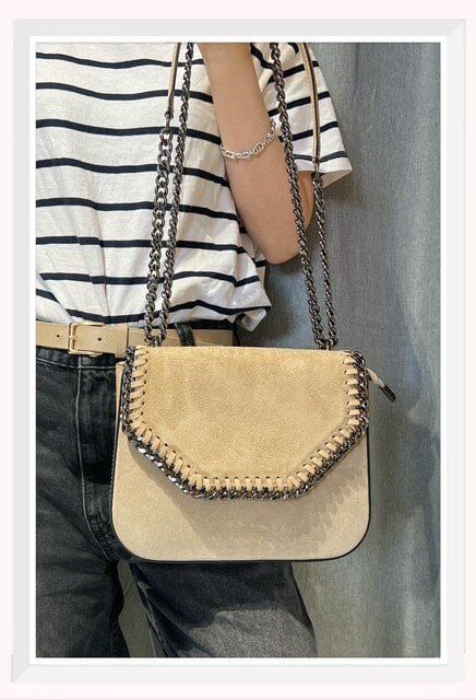 Sac bandoulière 100% cuir et daim , un accessoire indispensable pour un style élégant et intemporel .Conçu avec des matériaux haut de gamme , ce sac en cuir séduit par son toucher doux, son aspect velouté en daim et ses finitions avec sa chaine .
