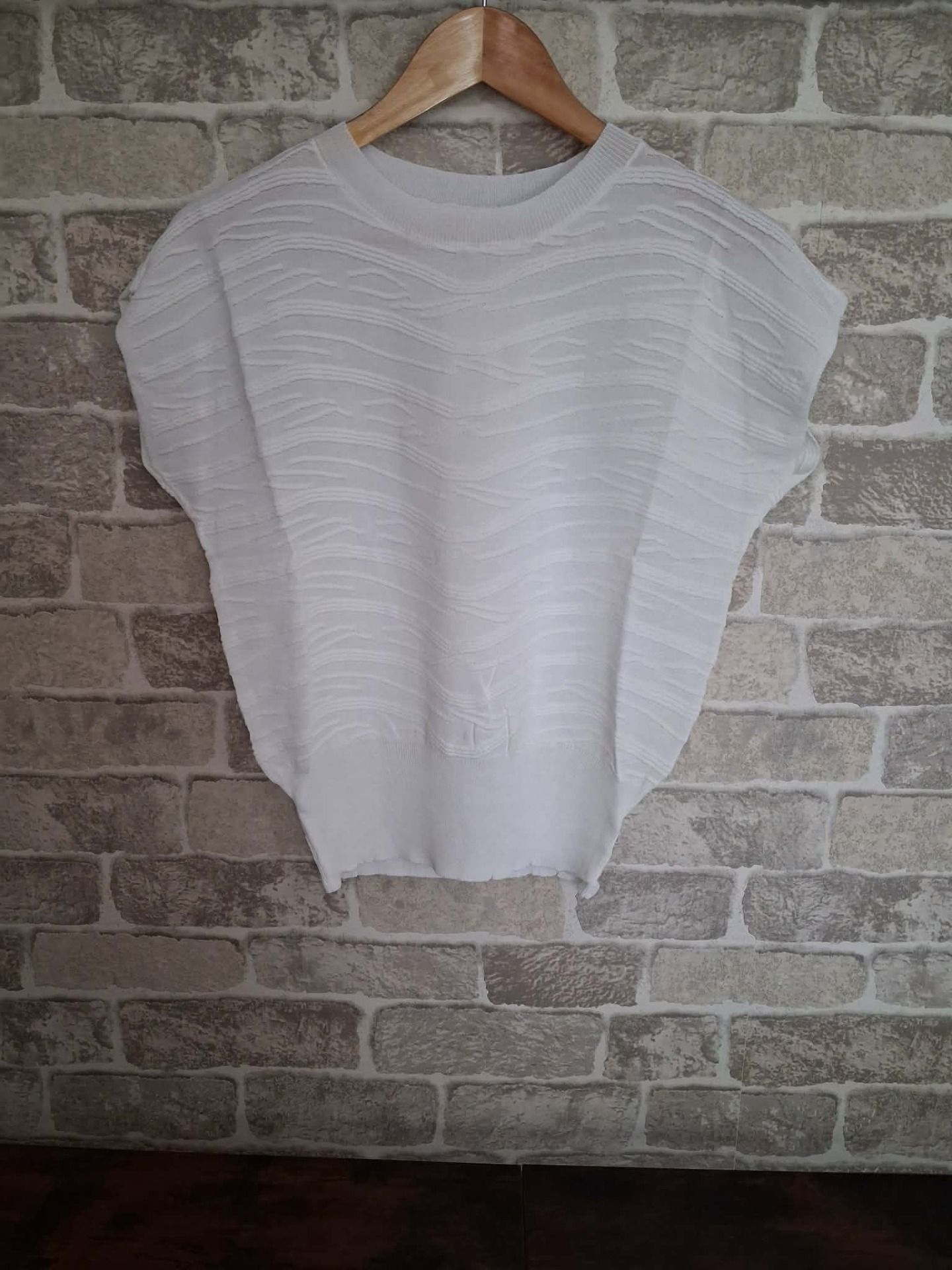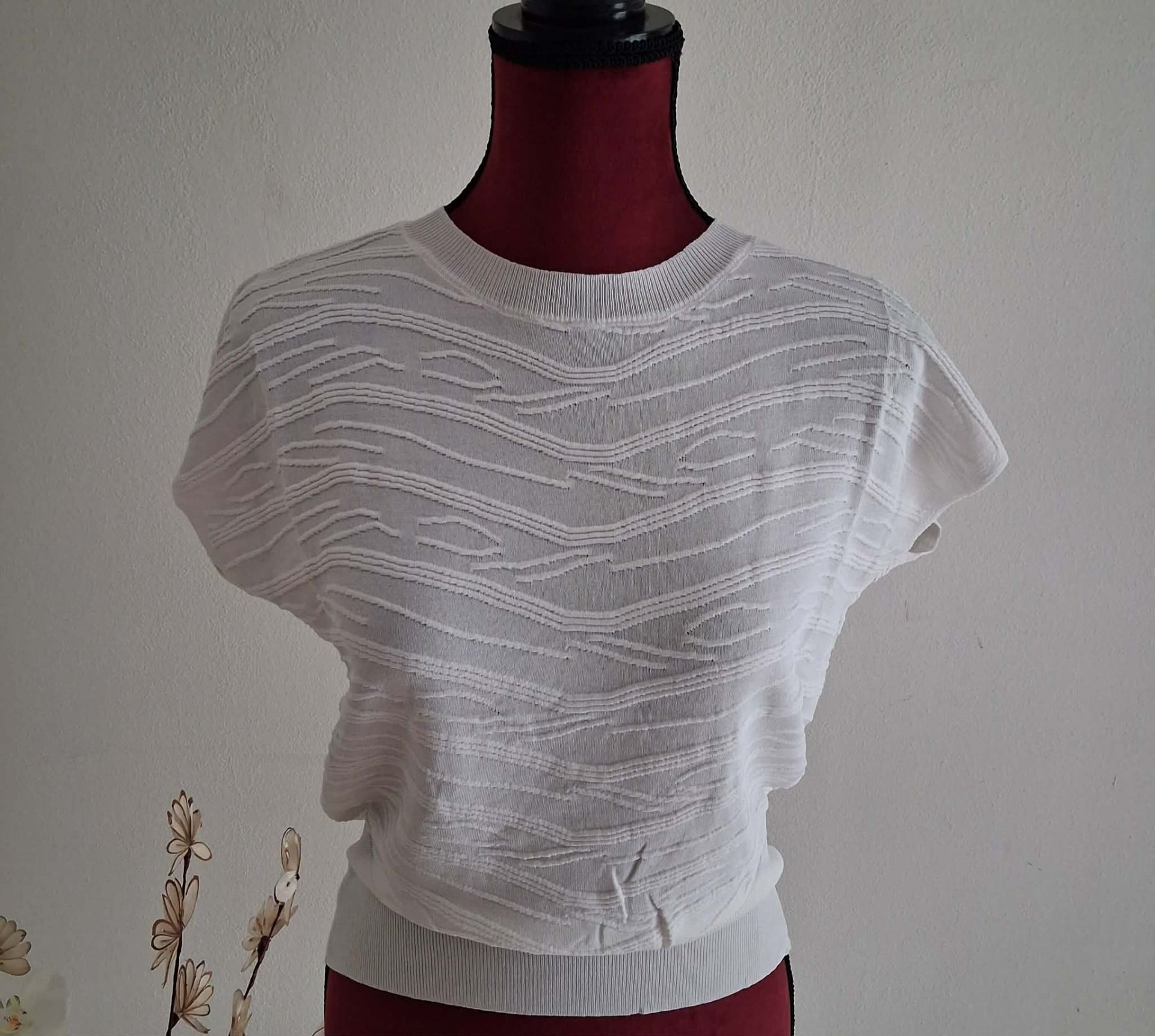 Haut léger en maille texturée de viscose et polyester pour un toucher doux et confortable. Coupe ample avec manches courtes tombantes et col rond. Sa teinte blanche et son motif discret apportent une touche élégante et facile à assortir.